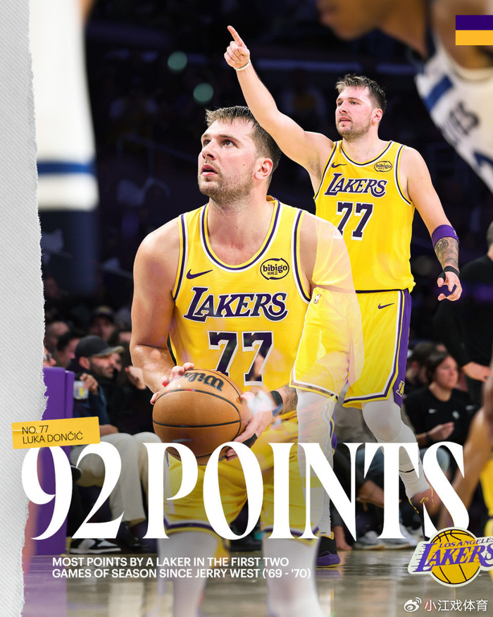 东契奇在NBA开季前两场比赛已累积92分,成为湖人队史开赛前两场得分最高的球员。