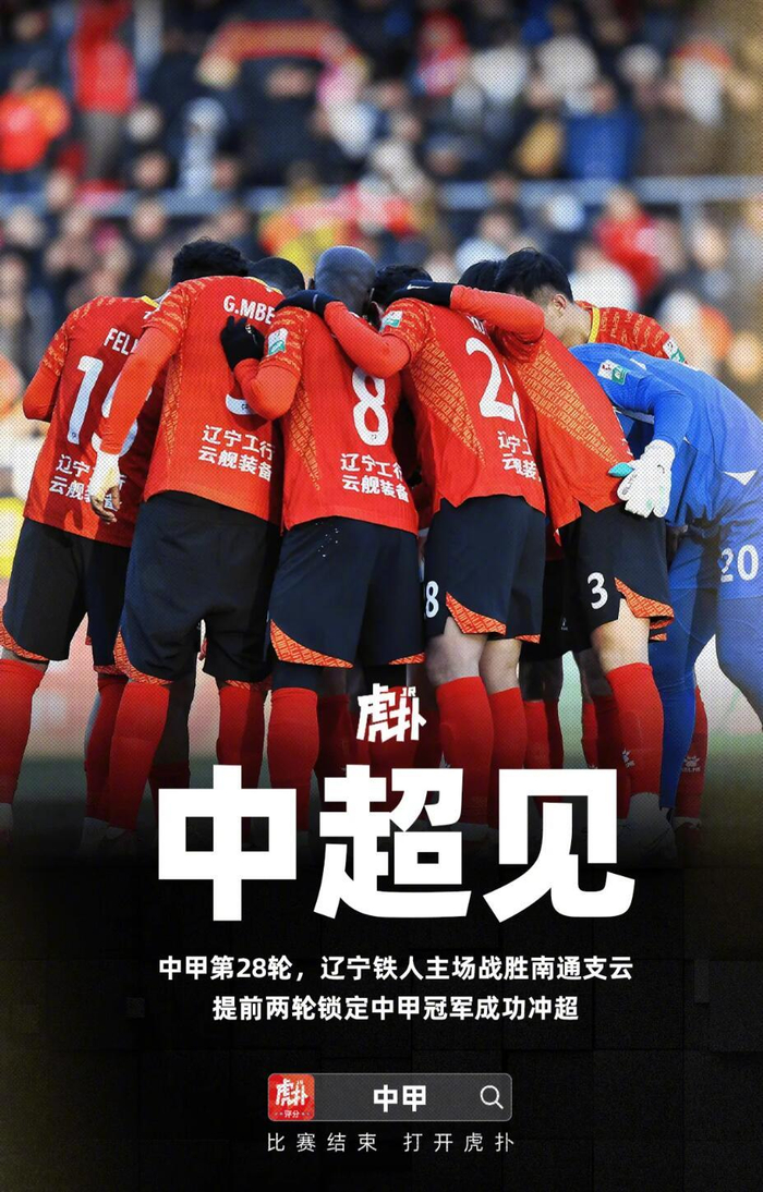 辽宁铁人在北京时间10月17日晚的第28轮比赛中以1-0击败南通支云,积64分,提前两轮锁定2025赛季中甲冠军。